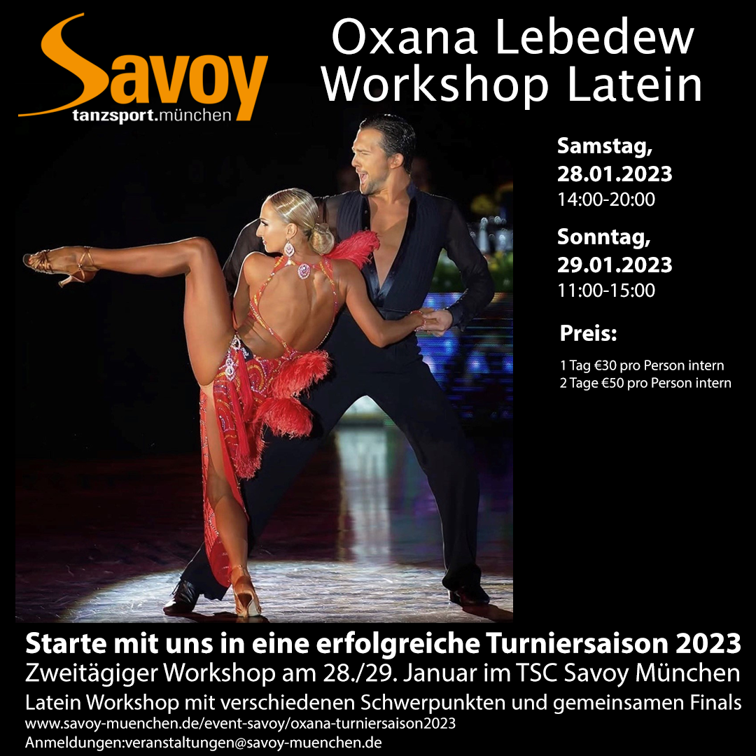 Lasst uns zusammen die Turniersaison 2023 beginnen. Oxana möchte alle interessierten Lateinpaare ( nicht nur Savoy interne Paare ) auf eine erfolgreiche Turniersaison 2023 einstimmen und anhand folgender Themen die entsprechenden Grundlagen schaffen: Programmpunkte: Samstag, den 28.01.2023: 14:00 - 14:45 […]