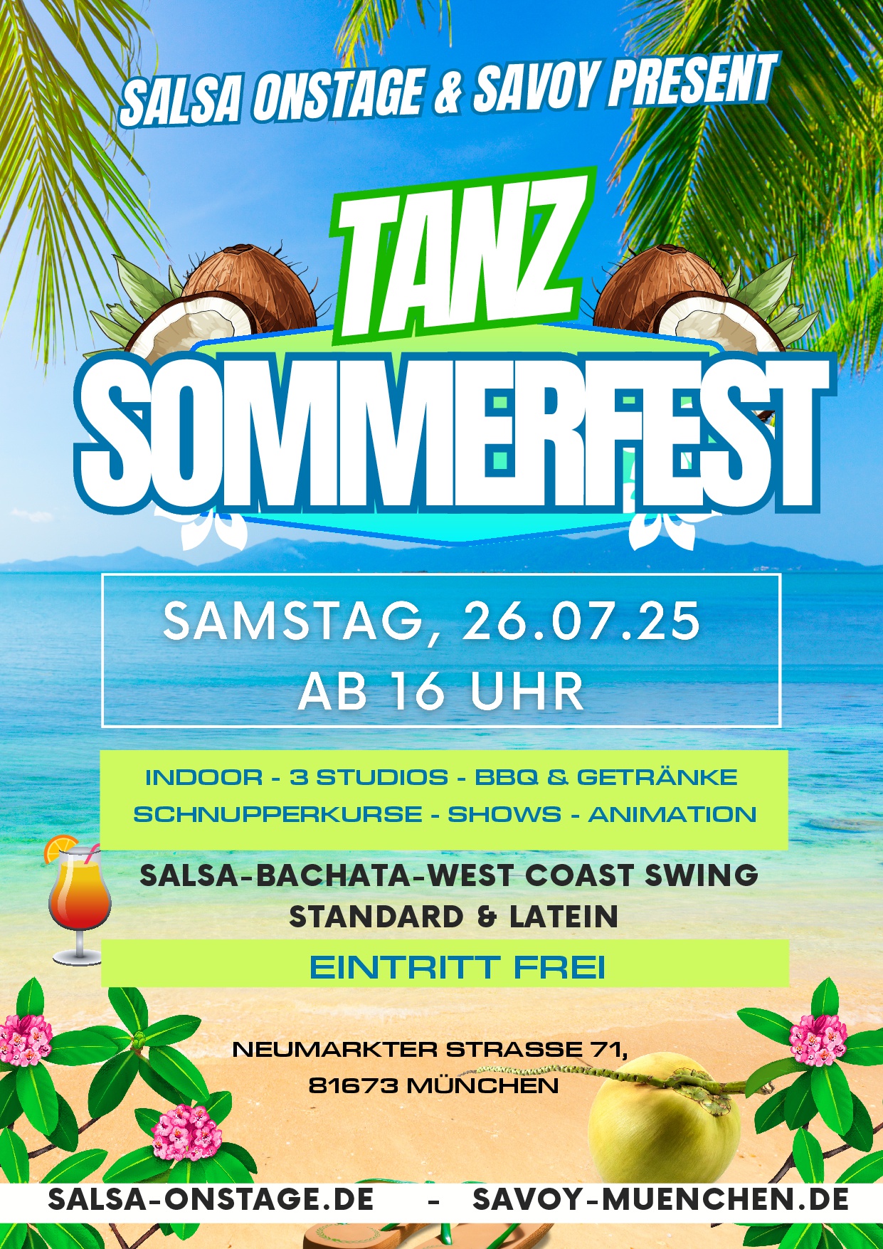 Zusammen mit Salsa OnStage veranstaltet der TSC Savoy ein großes Sommerfest! Im 2. Stock der Neumarkter Straße 71 erwarten euch- Musik, Tanz, Tanzshows, Schnupperkurse, Mitmachaktionen- Getränke (alkoholisch und antialkoholisch), Bratwürste, Salate, veg. Kebab, Semmeln, CrepesAb 22:00 Uhr Bachata & Salsa […]
