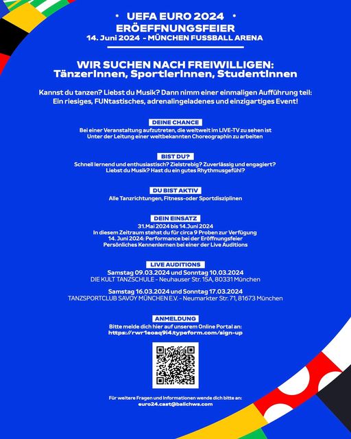 Audition zur Teilnahme an der Eröffnungsfeier der Fußball EM 2024 Kannst Du tanzen? Liebst du Musik? Dann nimm an einer einmaligen Aufführung teil. Ein riesiges, FUNtastisches, adrenalingeladenes und einzigartiges Event! Mehr zu den Audition-Terminen erfährst du über den QR-Code, bzw. […]