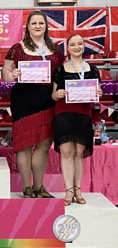 Johanna Kluge & Alexandra Ranner werden 2. in der C-Klasse in Open Equality Latin bei den Eurogames, die gleichzeitig die Europameisterschaften der European Equality Dance Association darstellen. Erfreulich ist dabei vor allem der geteilte erste Platz in der Rumba! Die 22. Eurogames fanden dieses Jahr in Lyon statt. Das Multisportevent konnte in über 30 Sportarten mehr als 5500 Sportler*innen verbuchen.