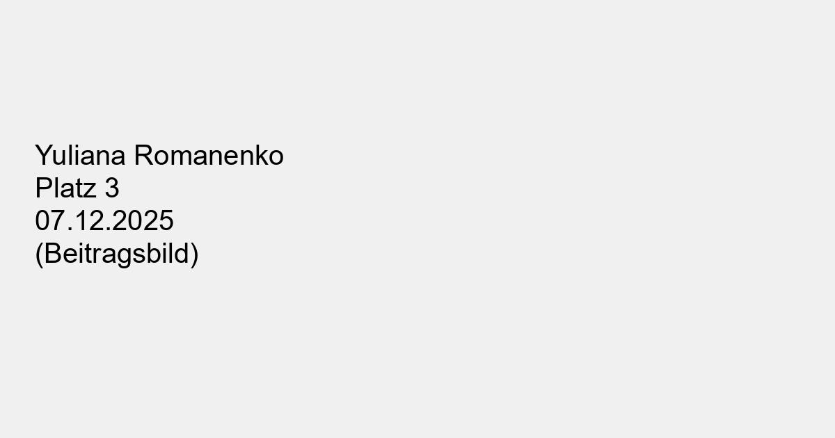 Die talentierte Tänzerin Yuliana Romanenko hat sich im Solo Kin I C Lat Turnier beim Bayernpokal Finale Solo U19 Standard & Latein, das am 07.12.2025 stattfand, hervorragend präsentiert. Unter den 6 gestarteten Teilnehmern in der Turnierklasse Unter 8 C Lat,